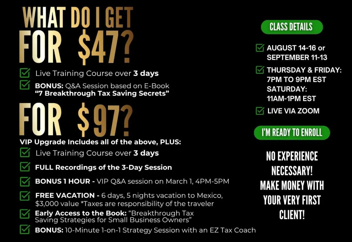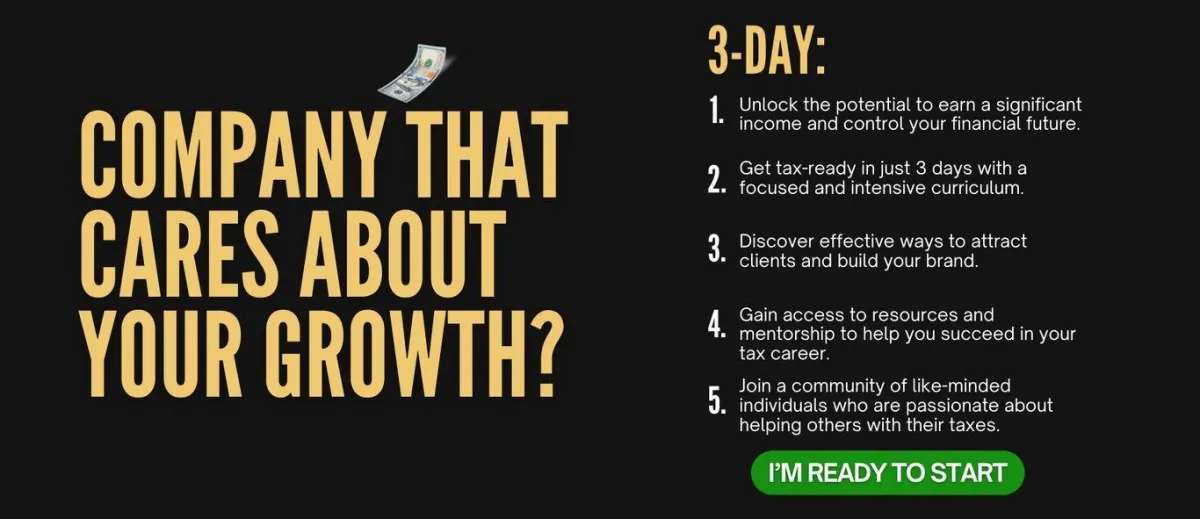 Join us for a high-impact 3-Day Tax Bootcamp designed to build your confidence, sharpen your skills, and show you what’s truly possible in the booming tax industry.
