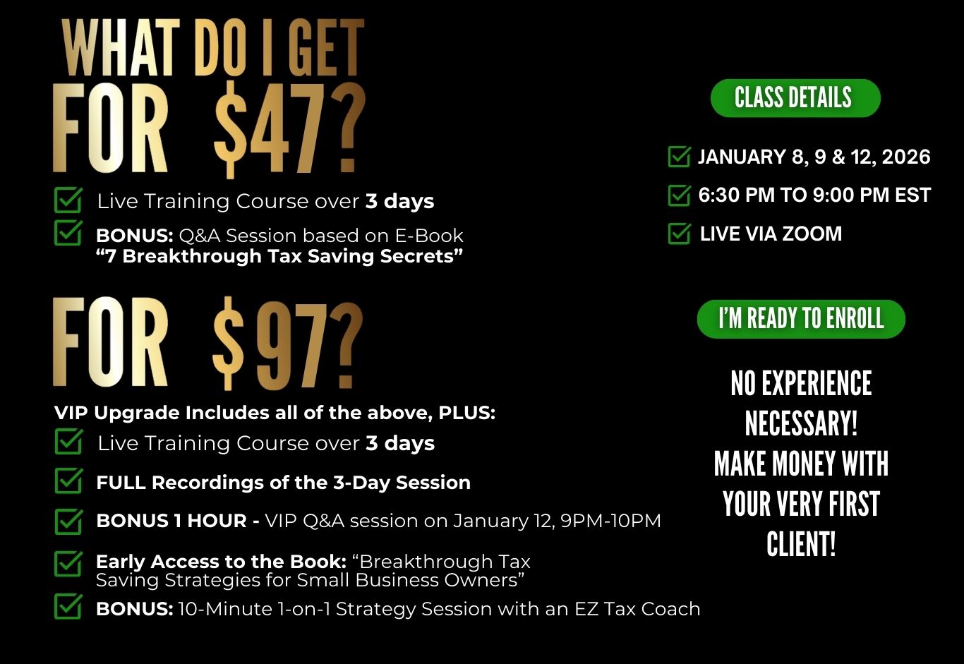 Whether you’re starting fresh or looking to strengthen your foundation, this Bootcamp is your launchpad into a profitable tax career or business.
